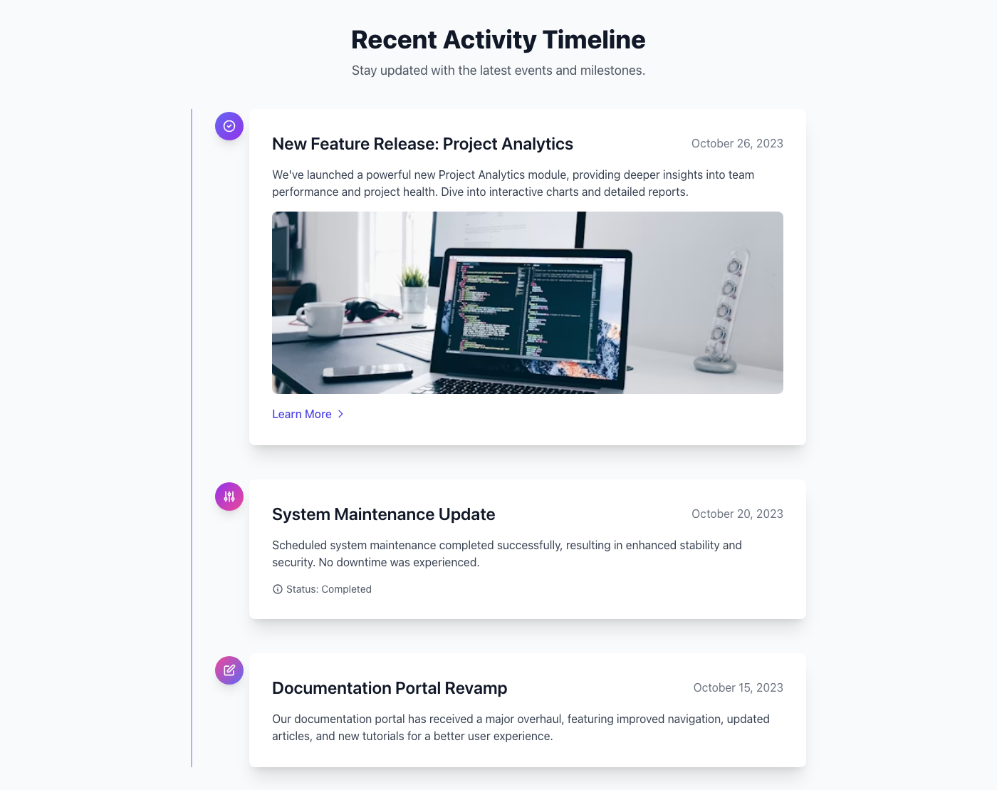 A modern dashboard design featuring a responsive vertical timeline for tracking chronological events. The 'Liquid Gradient Flow' art direction integrates subtle, vibrant gradients into key UI elements, providing a fluid and engaging visual experience while maintaining clarity.
